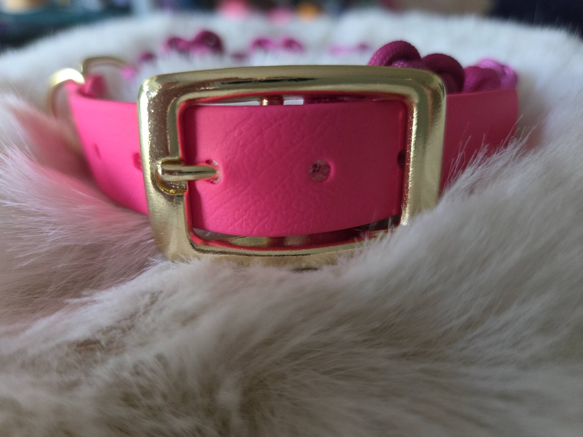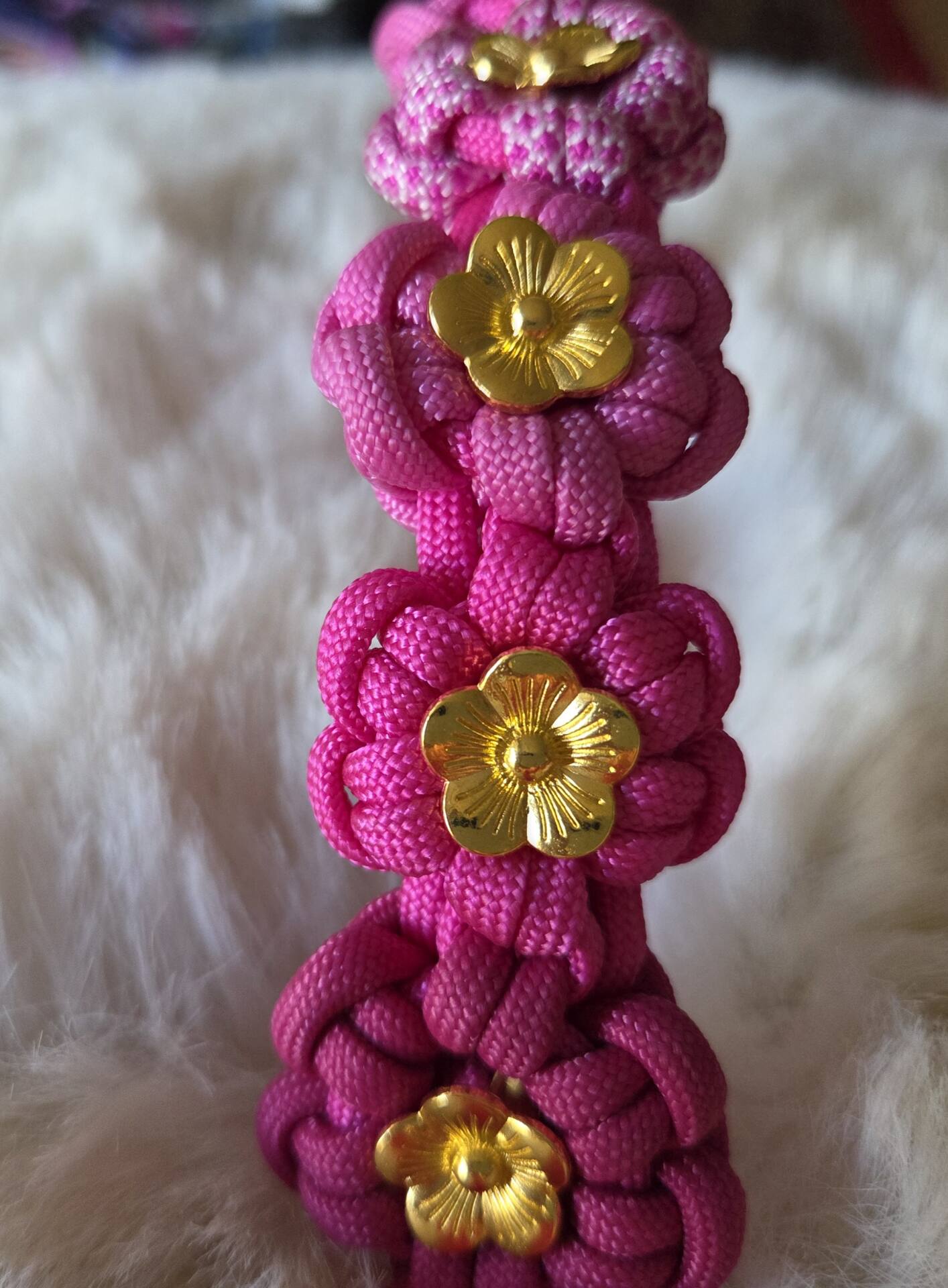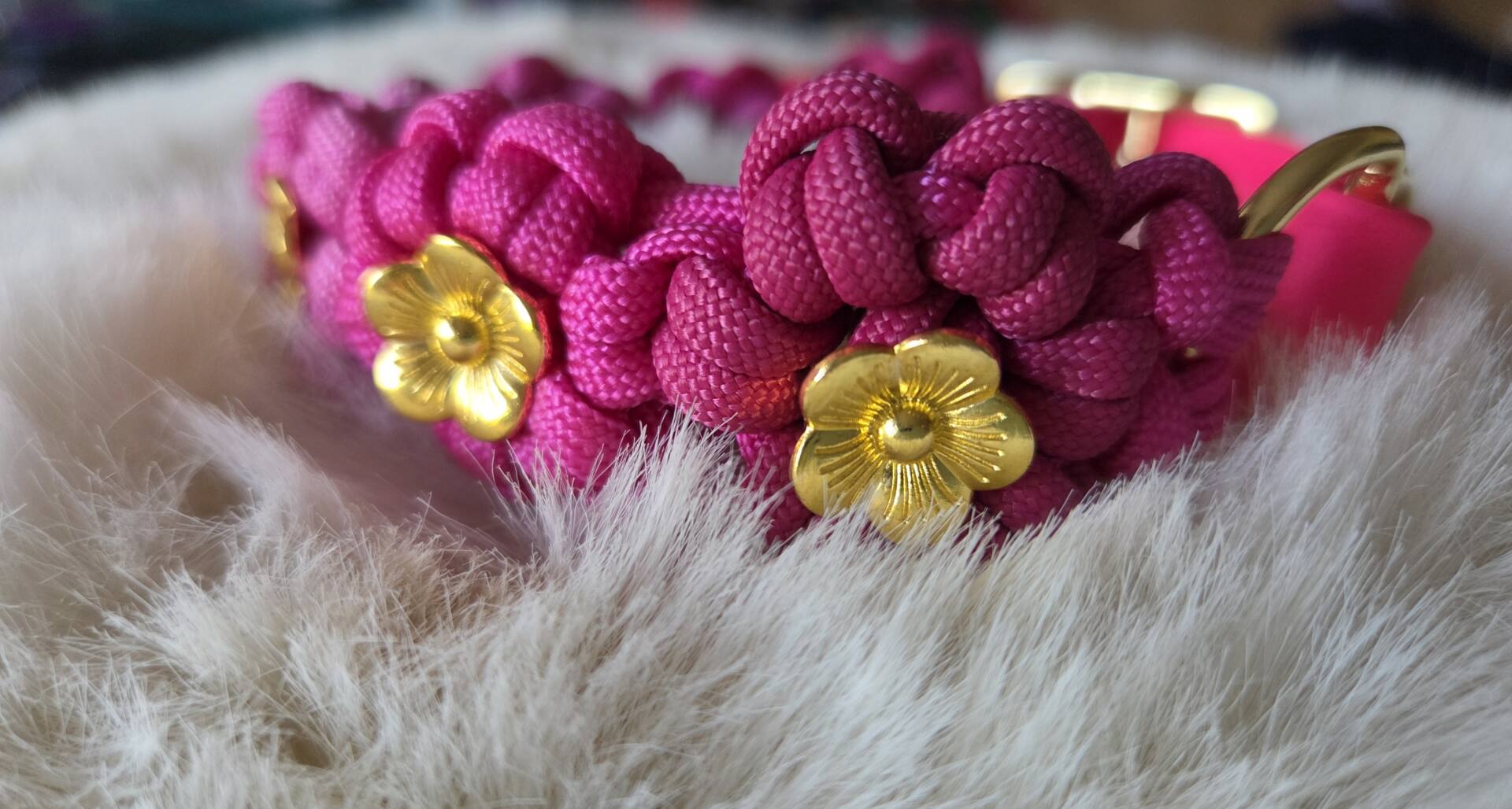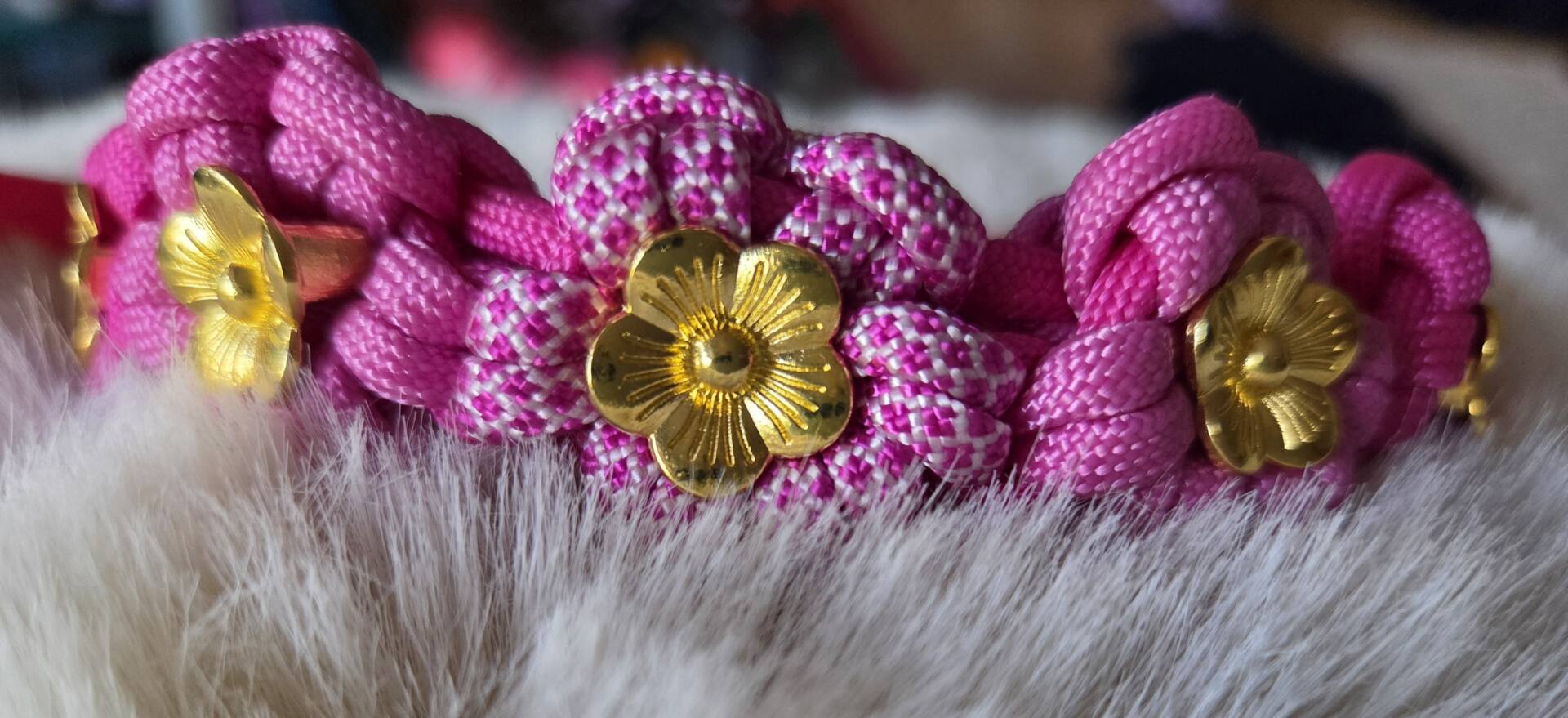 geflochtene Paracord Blumen in unterschiedlichen Pink-Tönen, veredelt mit goldenen Blümchen und Beschlägen