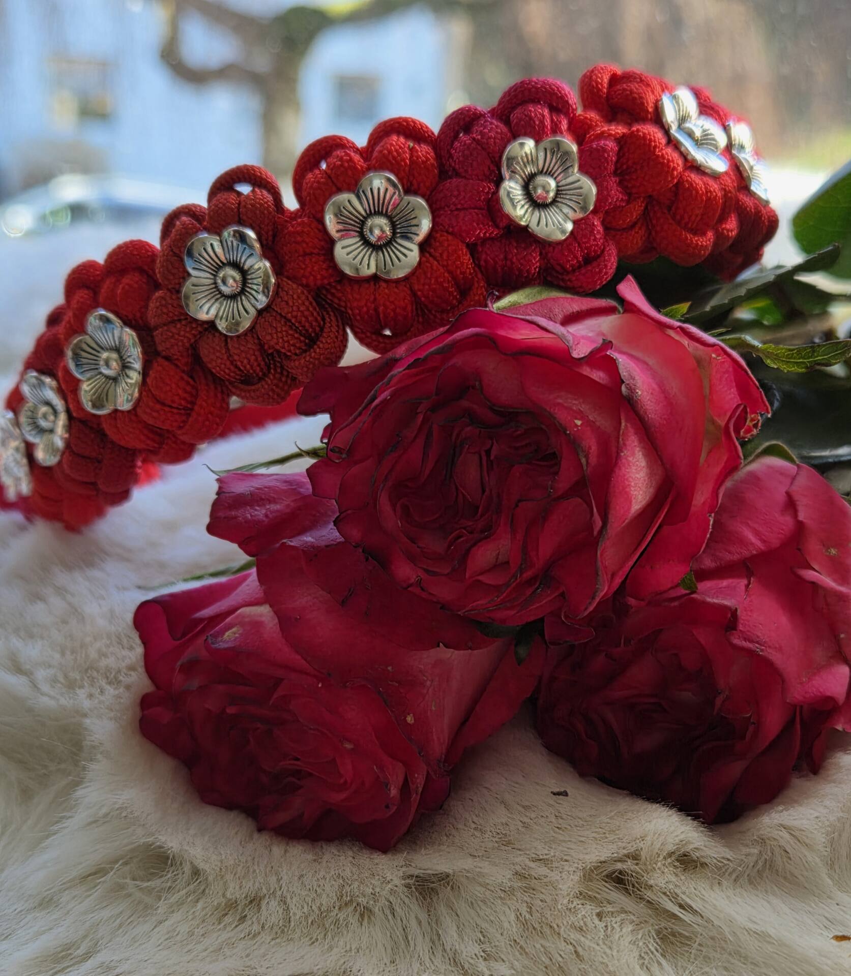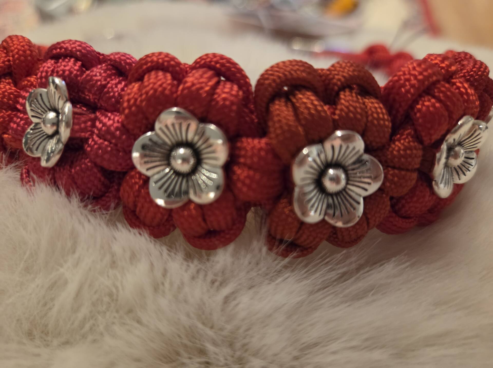 geflochtene Paracord Blumen in unterschiedlichen Rottönen, veredelt mit silberfarbenen Blümchen und Edelstahlbeschlägen