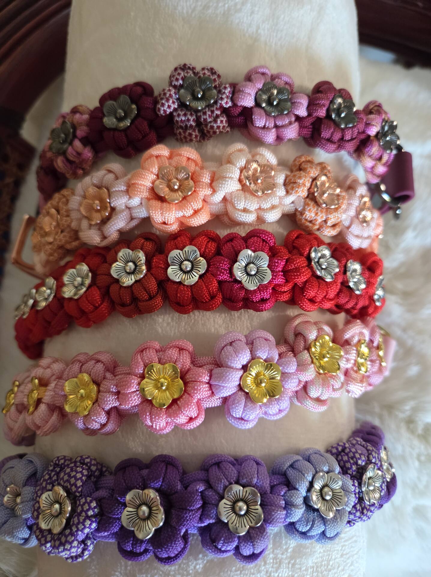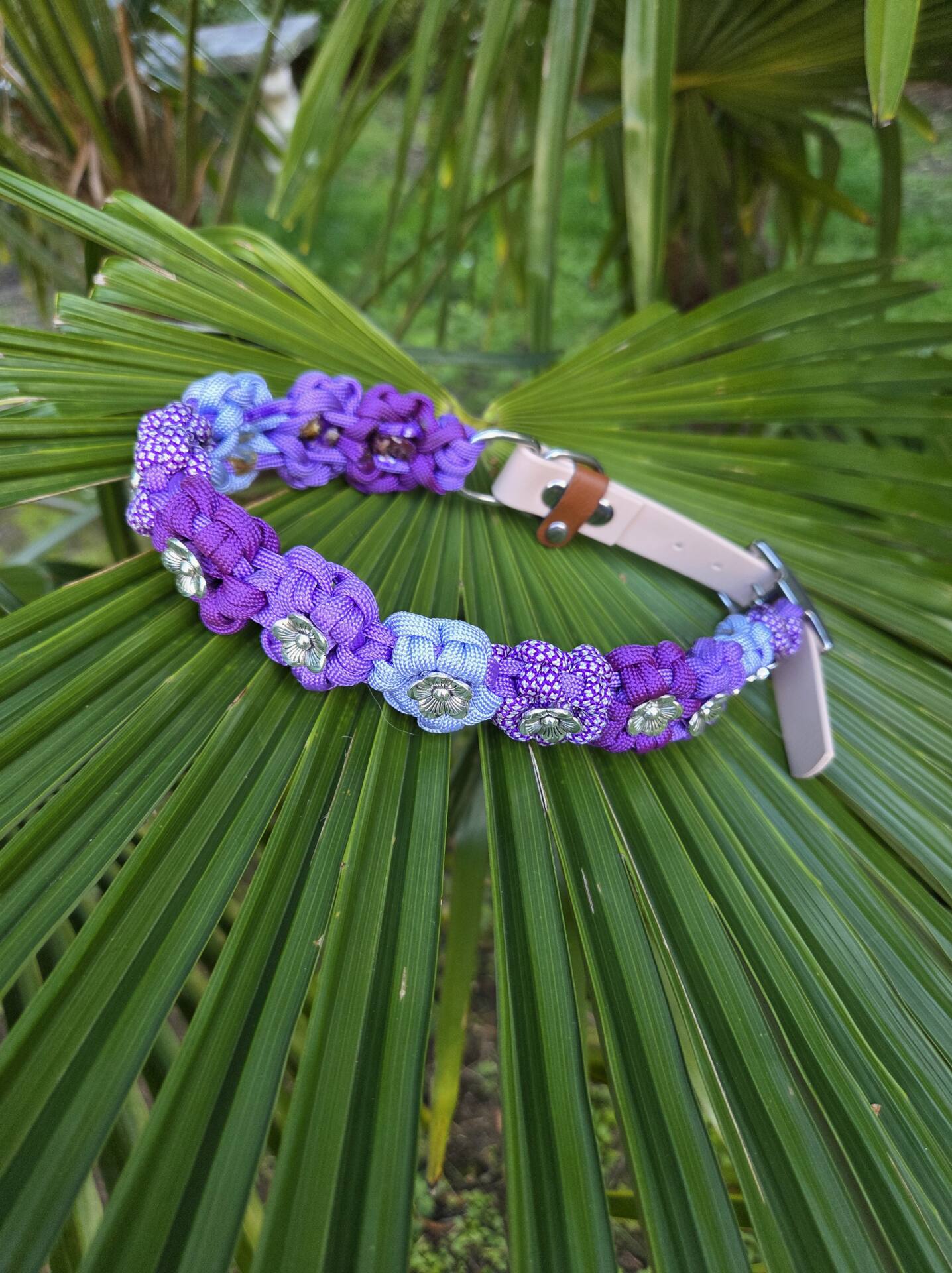 Blumenhalsband : 12 Paracord-Blumen in Lila- und Fliedertönen, deren Innenkern jeweils eine silberne Metallblüte ist