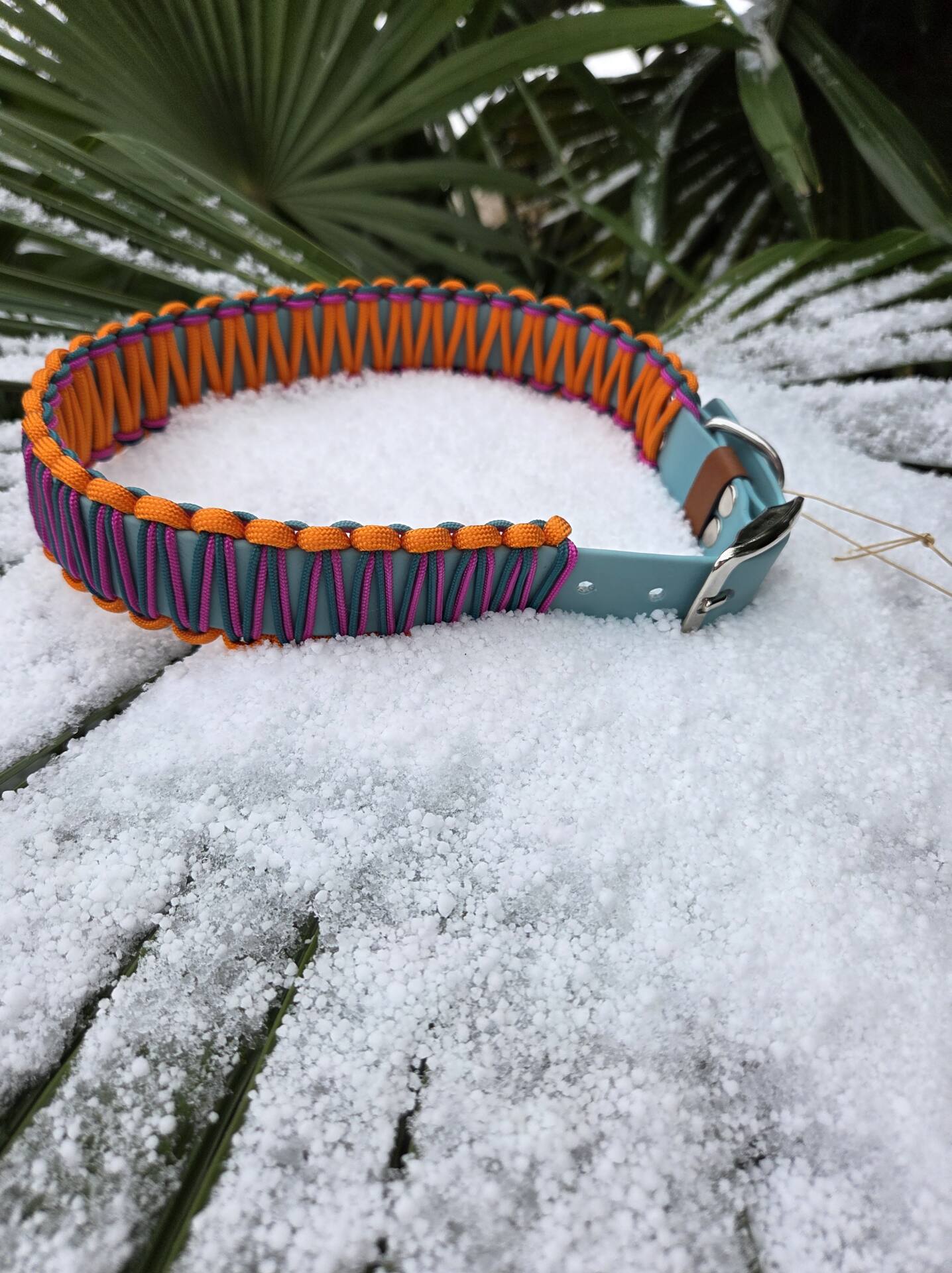 bunt und fröhlich – über dusty türkisfarbenem BioThane verflechten sich seitlich Paracord III orange und an der Oberseite Paracord II in pink und teal