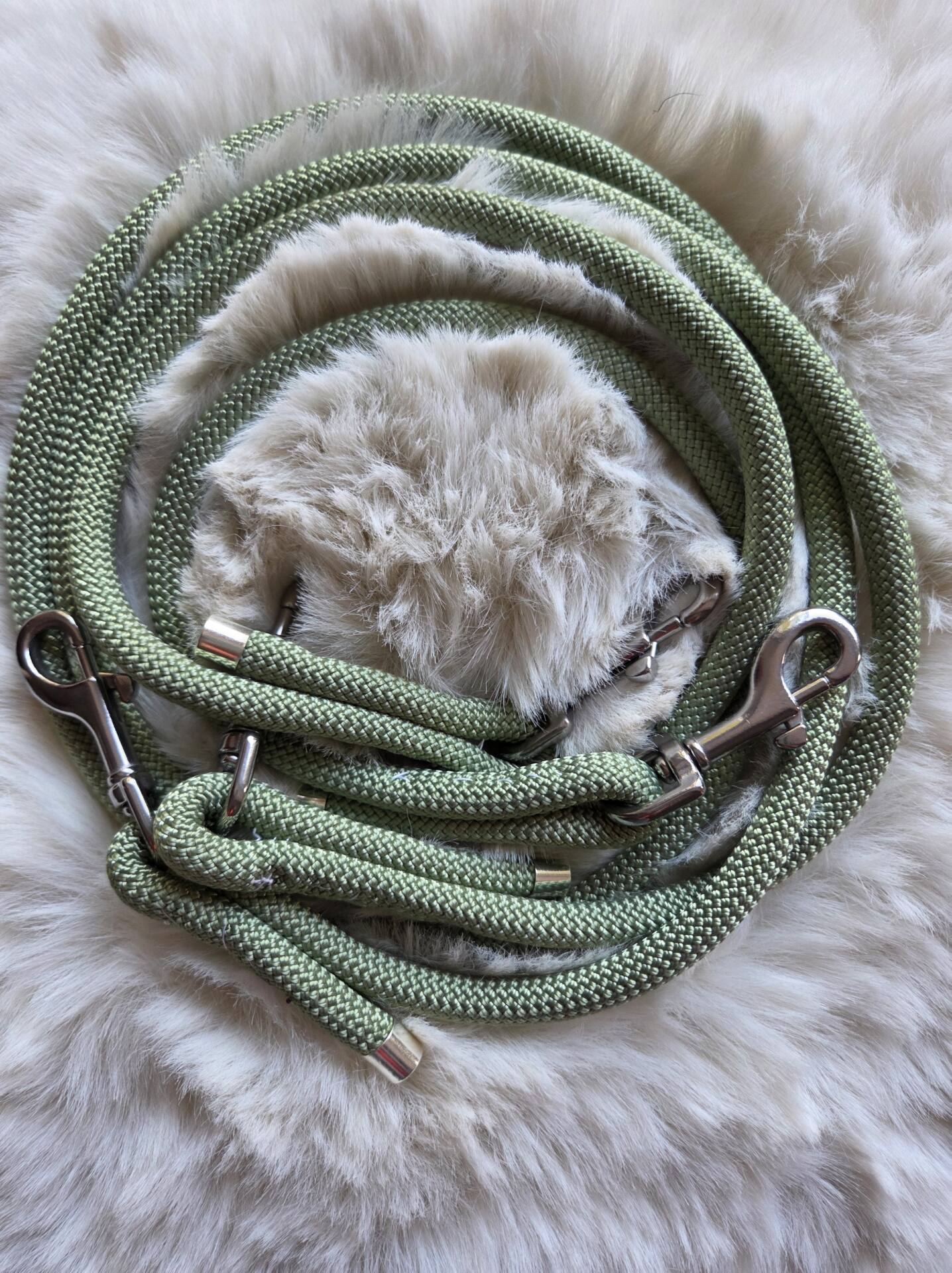 Ihr könnt auch das Material selbst aussuchen. Wie bei den „normalen“ Leinen auch . Mix und Match machts: Möglich ist BioThane, Paracord geflochen, PPM geflochten, oder Tau.